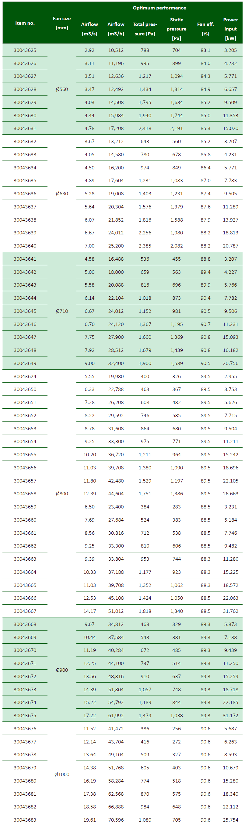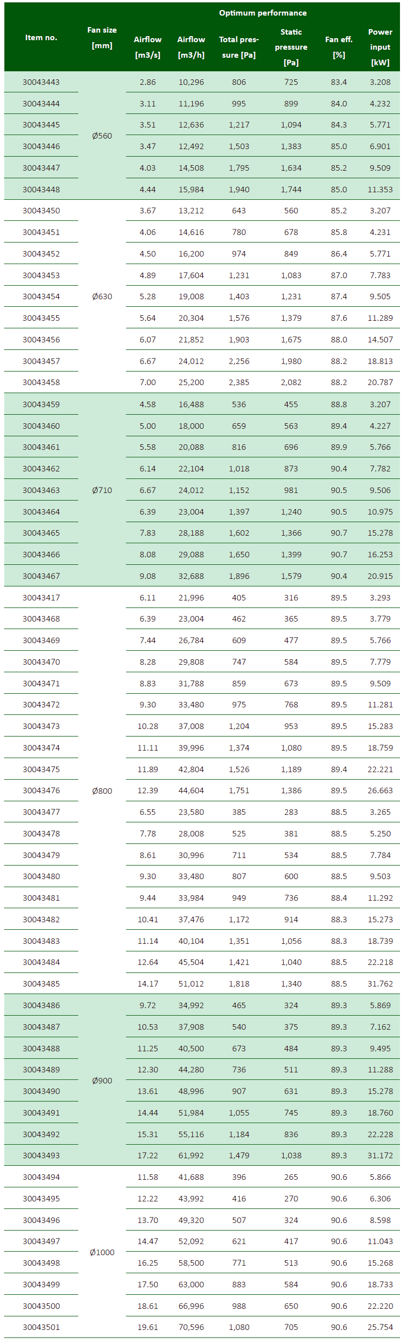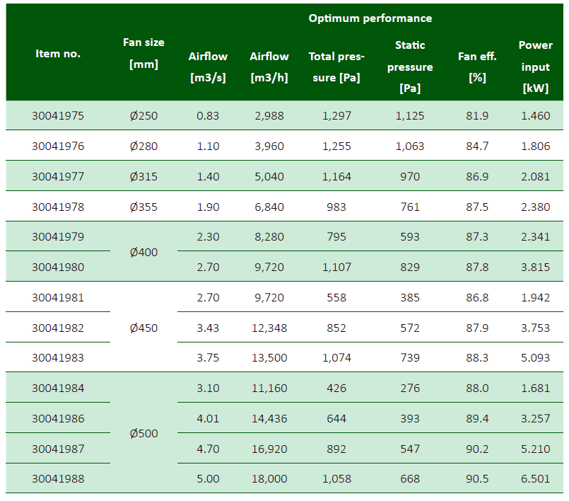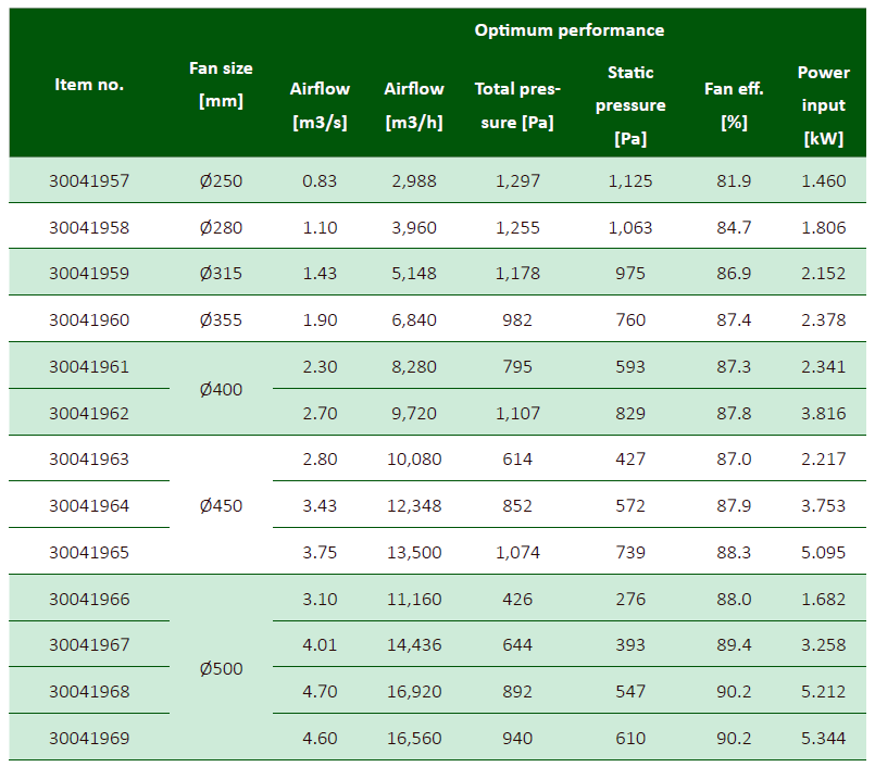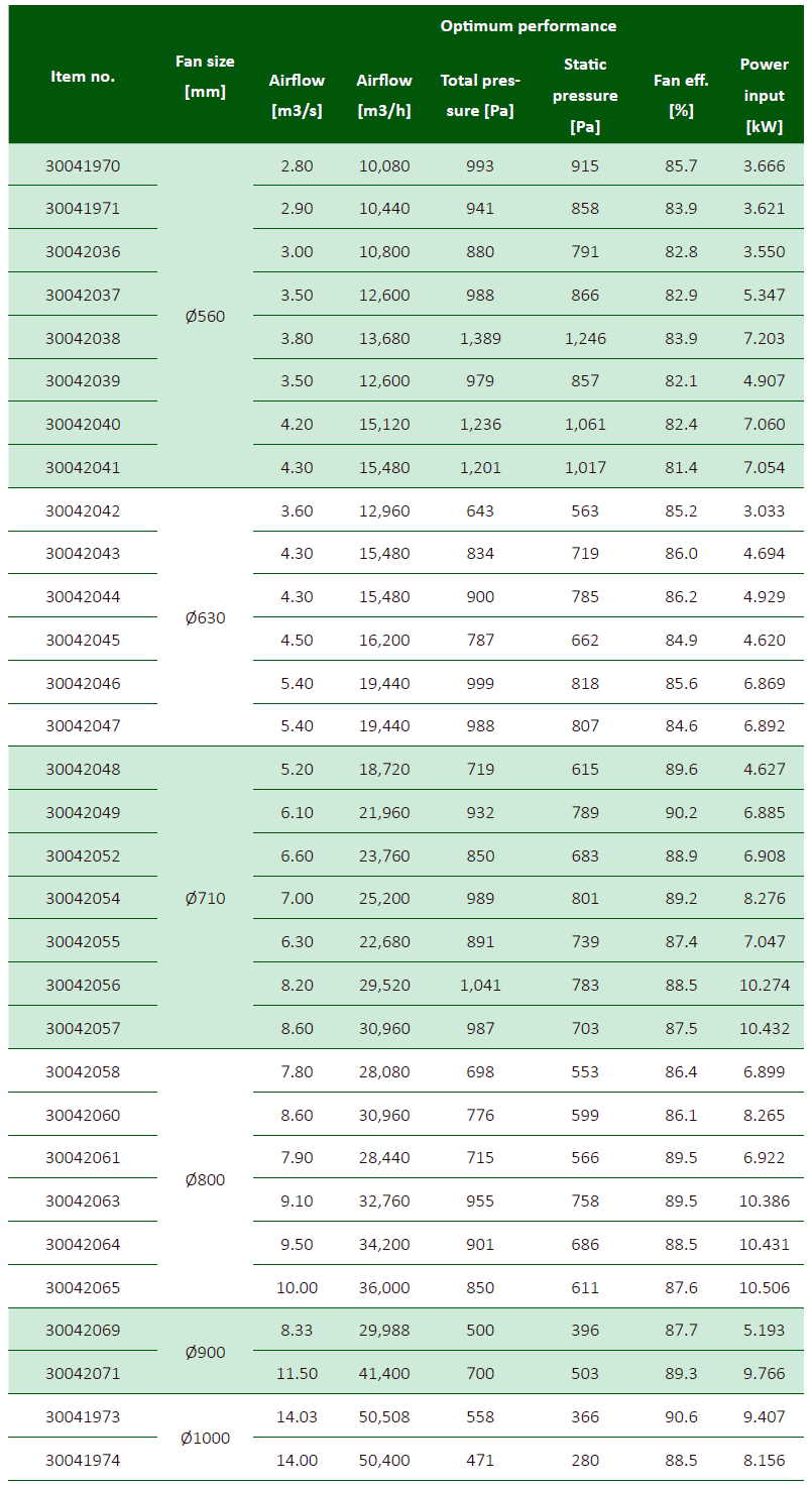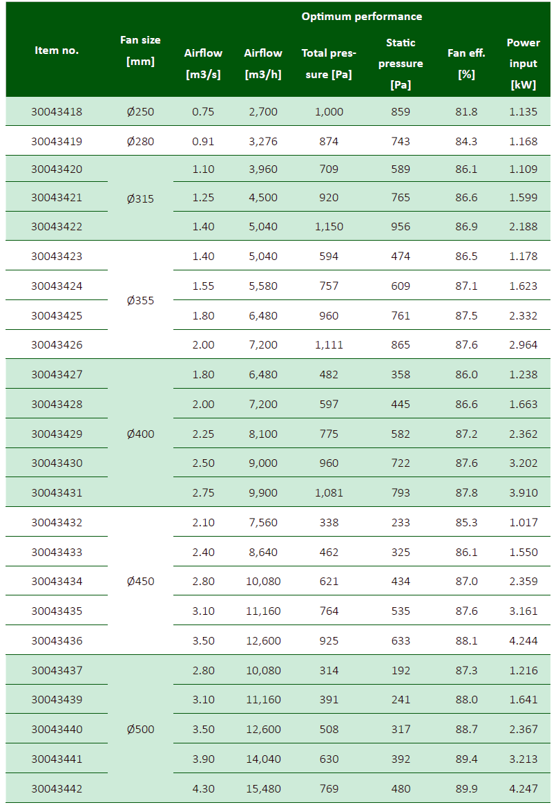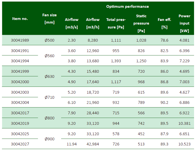 - 187 (AZL) und 24 (AZN) vordefinierte Kombinationen von Ventilator und Nabengröße, Volumenströme und Drücke