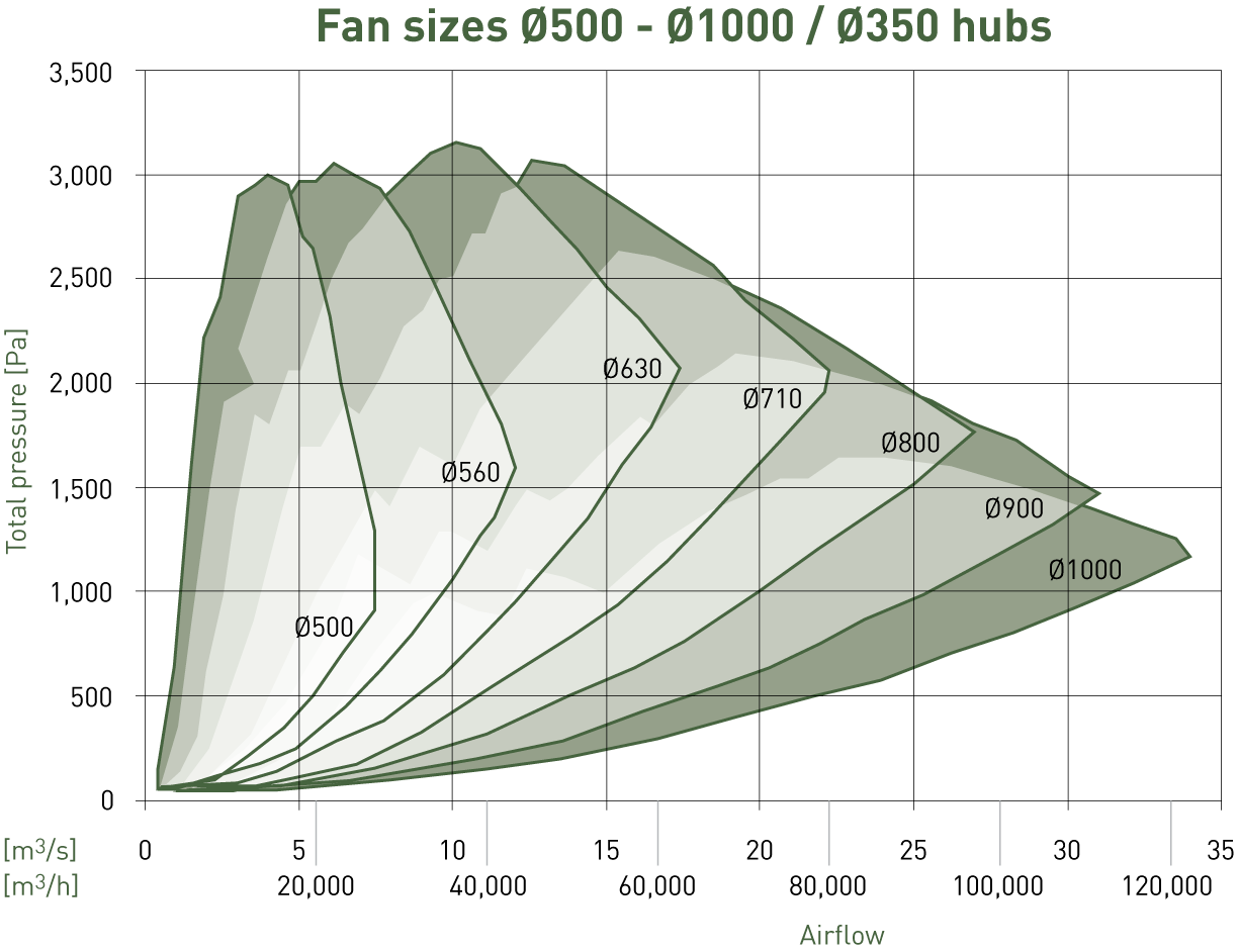- 13 afmetingen met waaierdiameters van Ø250 tot Ø1000 mm