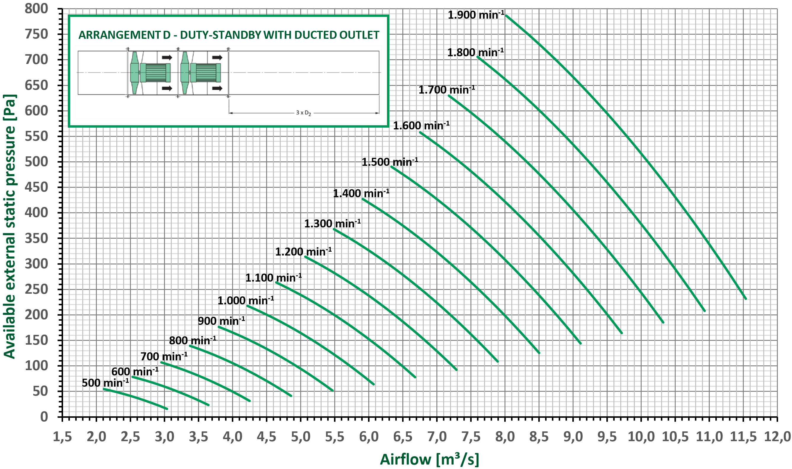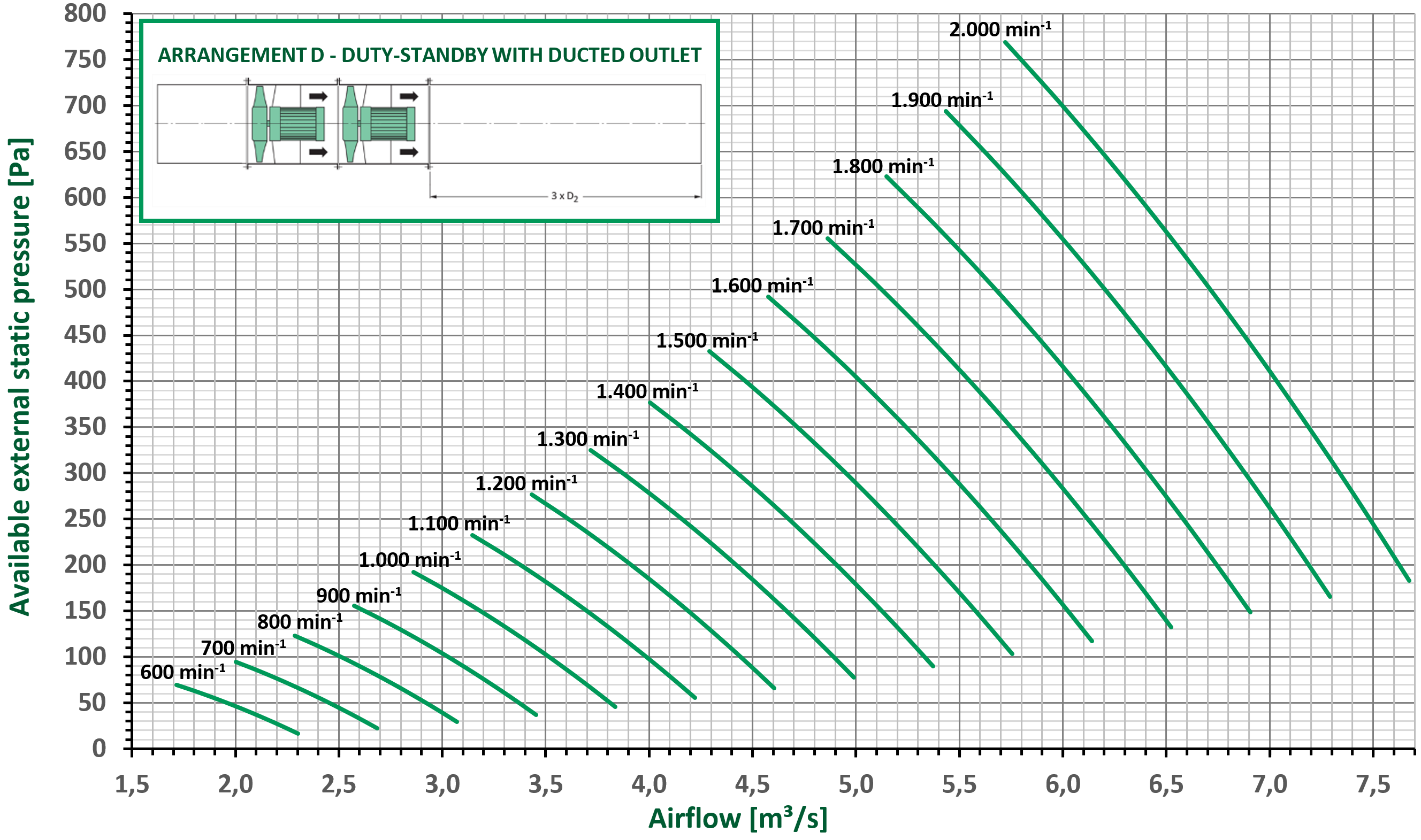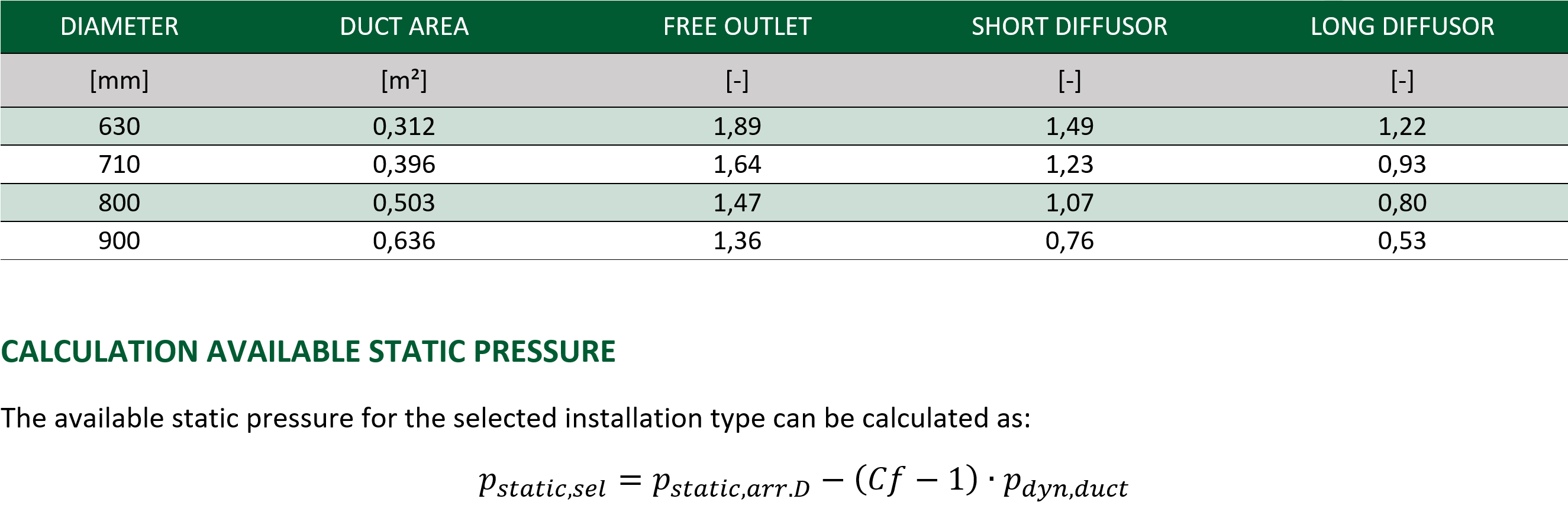 The fan performance curves are based on duty-standby operation of the dual fan smoke sets with a ducted outlet. Installing these fan smoke sets with a free outlet (arrangement C) causes additional loss of dynamic pressure in the fan outlet. By fitting a diffuser on the outlet, some of this dynamic pressure loss is recovered as static pressure. To compensate for the different outlet configurations, the below correction factors (Cf) can be used.