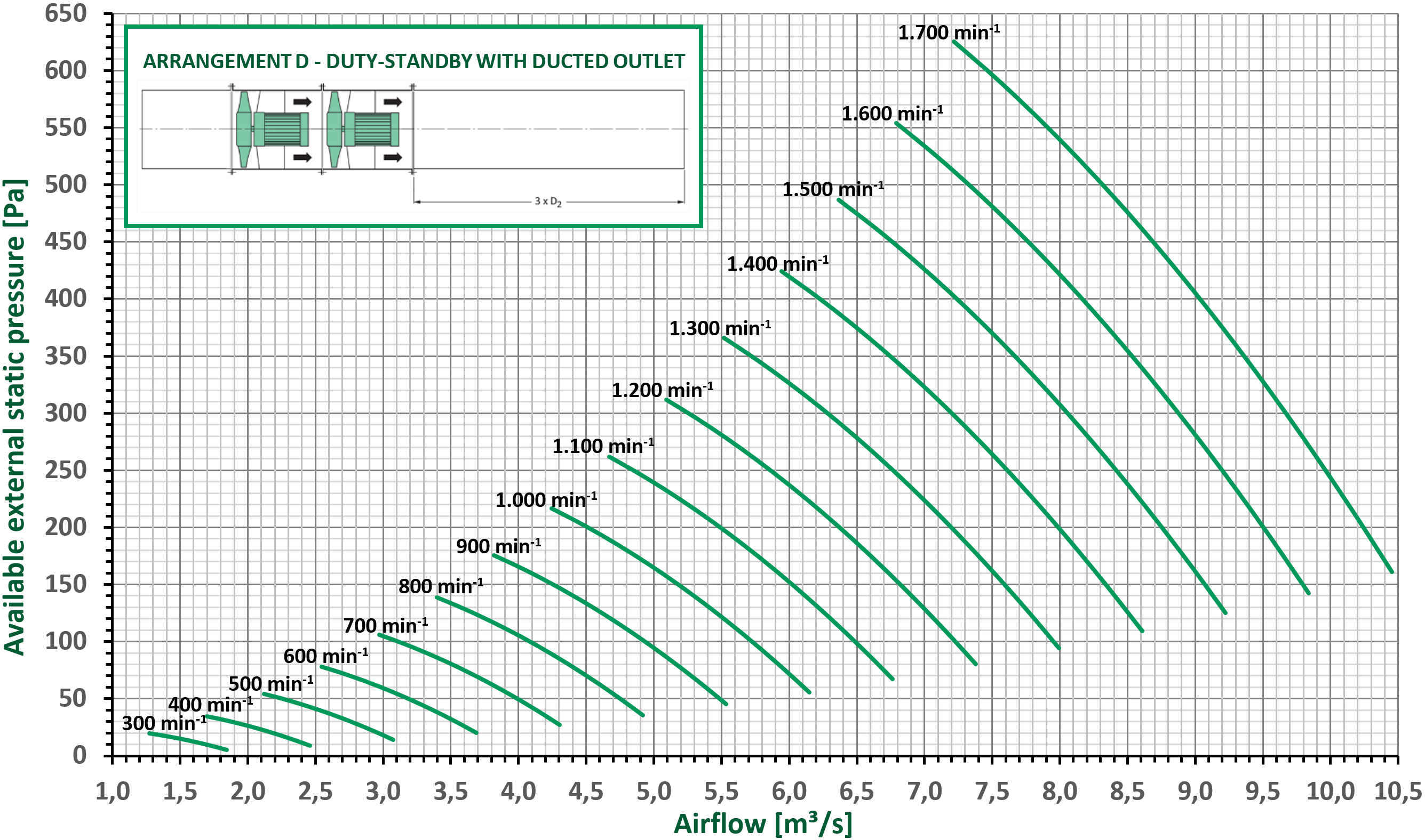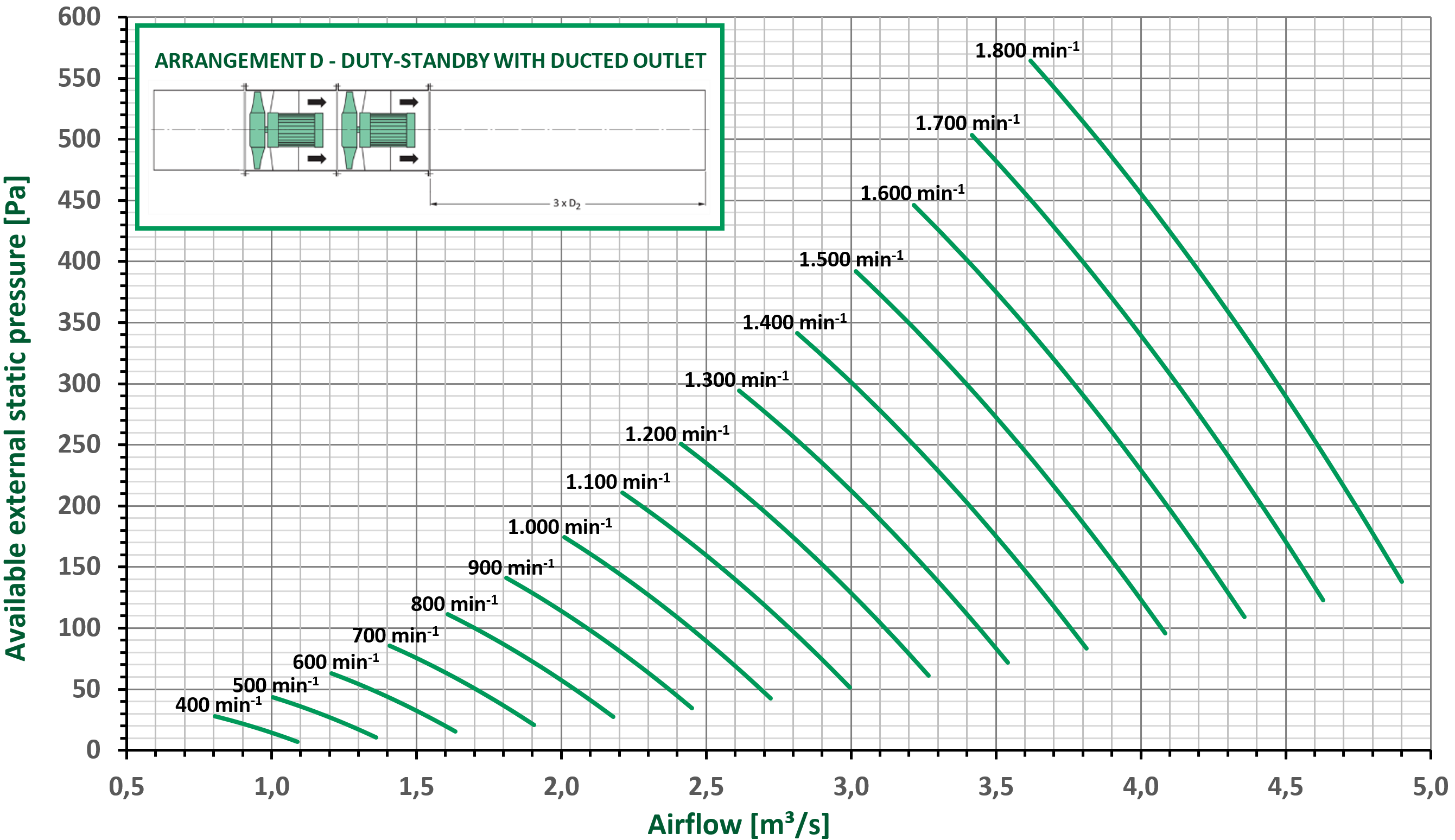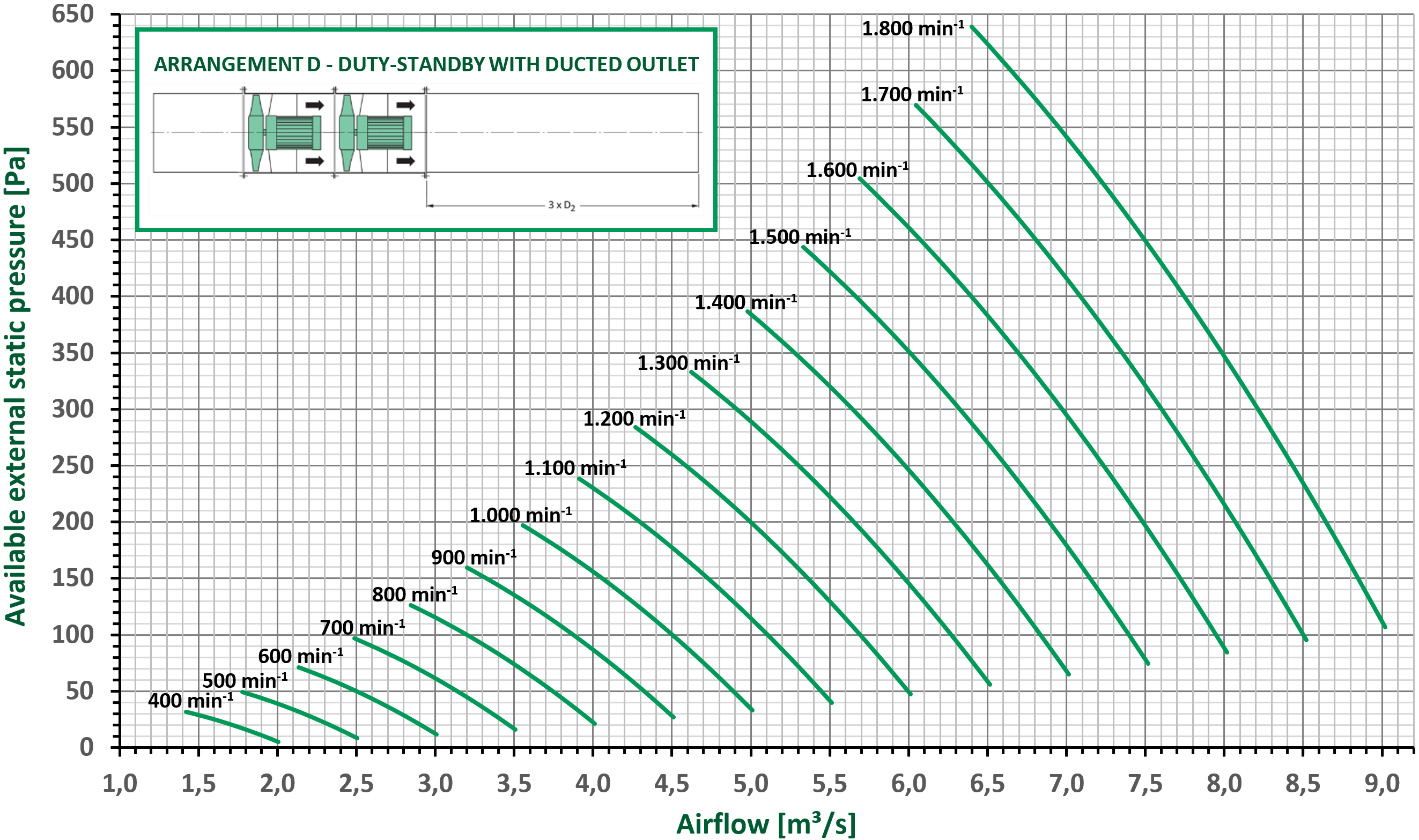 The fan performance curves are based on duty-standby operation of the dual fan smoke sets with a ducted outlet. Installing these fan smoke sets with a free outlet (arrangement C) causes additional loss of dynamic pressure in the fan outlet. By fitting a diffuser on the outlet, some of this dynamic pressure loss is recovered as static pressure. To compensate for the different outlet configurations, the below correction factors (Cf) can be used.